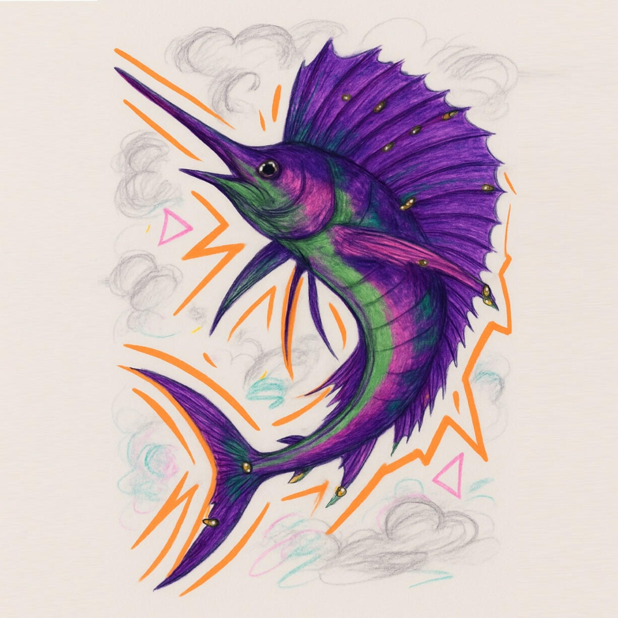 Prompt: A surreal mixed-media style illustration of a floating or falling sailfish, suspended in mid-motion as if weightless, twisting dynamically in the air. Its long, spear-like bill and tall dorsal fin dominate the composition, drawn with expressive pencil-like strokes and outlined with bold, uneven black contours. The body is filled with vivid and striking colors: deep purples, vibrant greens and glowing magentas. Make the sharp, bold like markerstipes surrounding the fish, fluorescent orange like a traffic cone. The colors are layered in expressive, uneven strokes, as if made with felt-tip pens, markers, and raw pencil textures, enhancing a handmade look. The orange highlights glow with energy, tracing along the fins and bill, symbolizing motion and tension. The surreal atmosphere is amplified by abstract swirling clouds, neon sparks, and geometric shapes in the white background, reinforcing the sense of chaotic energy and emotional struggle. The overall style should feel like a traditional drawing on paper, mixing pencil sketches, marker stains, and highlighter pops — expressive, raw, and full of movement.