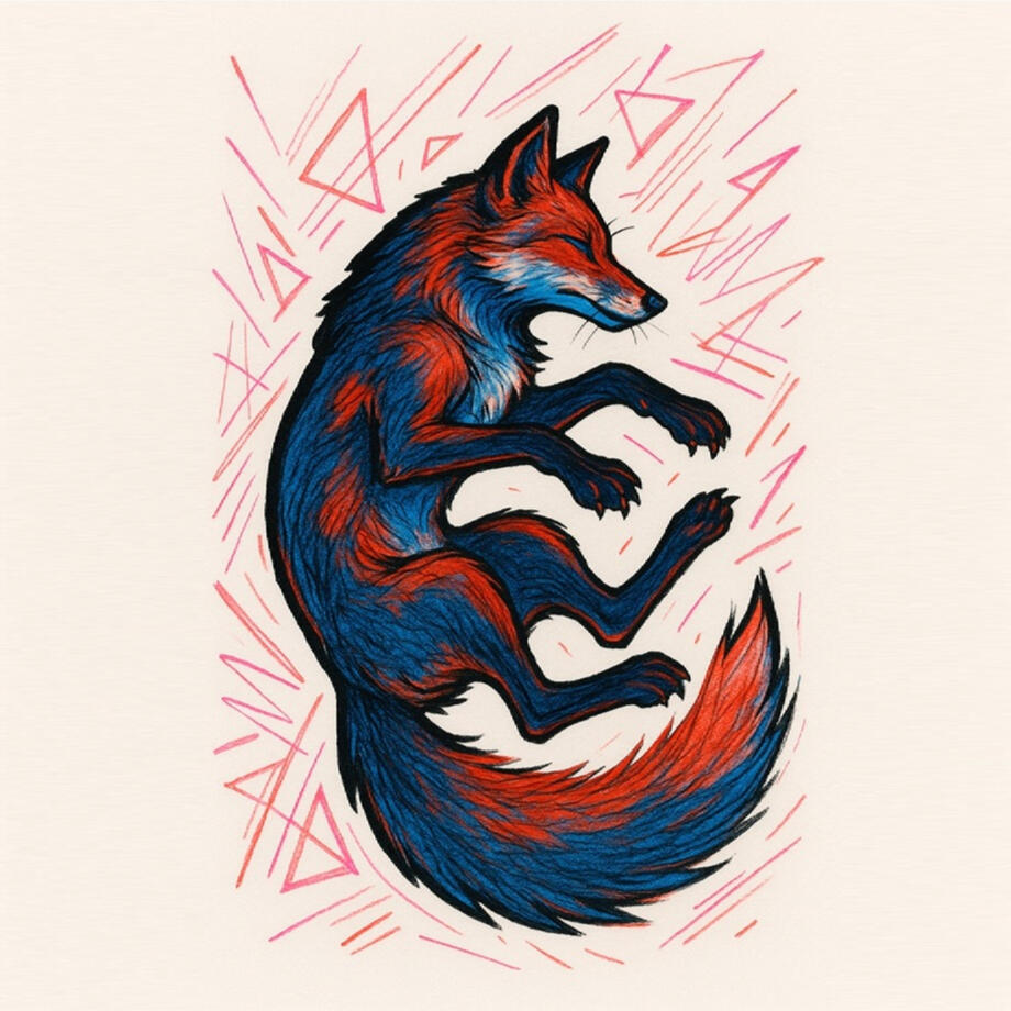 Prompt: A surreal mixed-media style illustration of a fox in mid-air, floating or falling in a dynamic and expressive pose. The fox is highly detailed with pencil-like fur textures and expressive shading, combined with bold marker and felt-tip pen coloring. The color palette focuses on rich deep blue and fiery red tones, blending together to create contrast and motion. The figure is outlined with a thick, strong black contour, especially along the back, giving it a striking handmade look. Background is white, decorated with abstract energy lines and geometric shapes in neon pink and red, drawn as if with highlighters or colored markers. The overall style should look like a traditional handmade drawing on paper, combining pencil sketching with vibrant marker fills and ink outlines. The pose of the fox should convey suspension and motion, as if caught mid-fall, with a sense of emotion and surreal energy radiating from the composition.